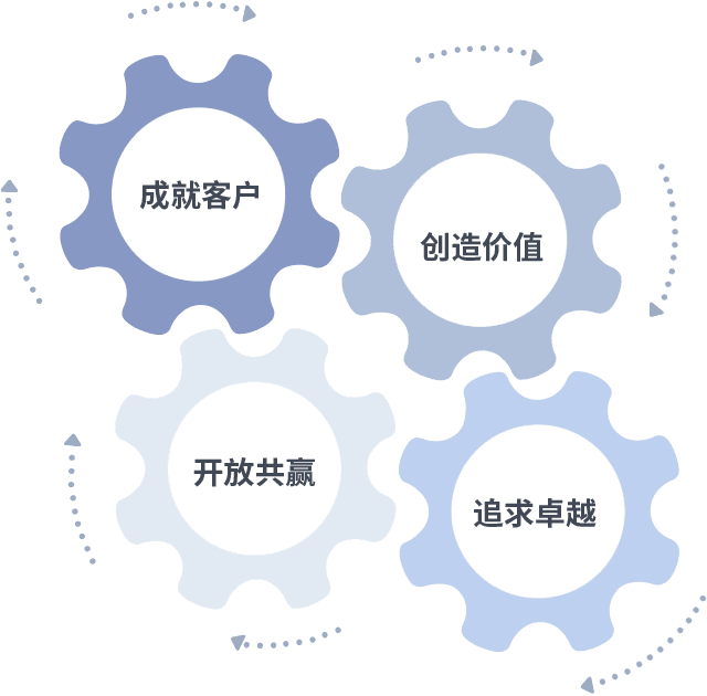 成就客户是一切决策的出发点,,,创造价值是衡量所有工作的标准,,,追求卓越是我们做事做人的态度,,开放共赢是我们的格局也是最终的结果。。价值观的齿轮环环相扣,,推动着组织里的每个人不断向前。。。